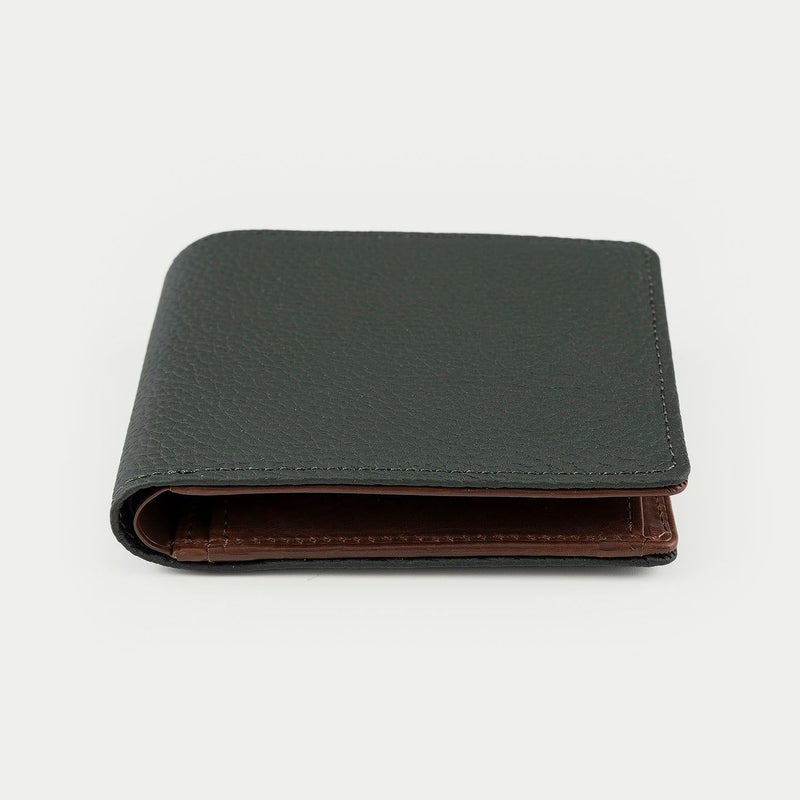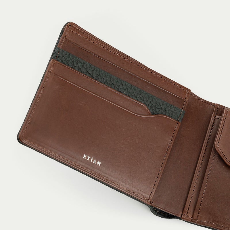 二つ折りタイプのオールインワン設計でありながら、スーツのポケットにもコンパクトなバックにもスマートに収まって持ち歩ける、薄さにこだわり抜いた二つ折り財布。外装には、しなやかな柔らかさとナチュラルなシボが魅力的なドイツ・ベリンガー社製「シュランケンカーフ」を採用し、キズが付きにくく色落ちもしにくいので、ラフな扱い方をしてもキレイな状態のまま使いこなせます。カードポケット1段の内装装飾として外装と同じ素材&カラーをあしらい、内装その他の見えるパーツすべてに牛革を使用して贅沢感を漂わせながら、内装装飾が差し色のアクセントになり洒落感を創出。その下2段のカードポケットのカッティングラインにはカーブが施され、エレガントさを醸し出しています。