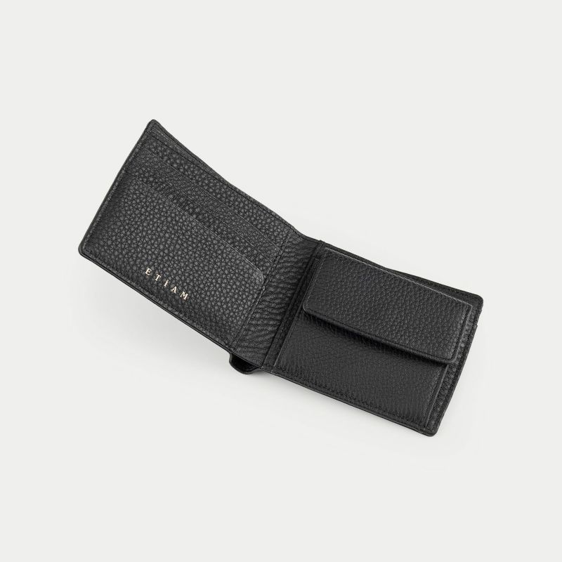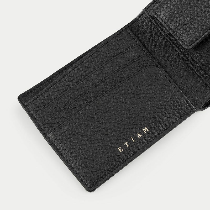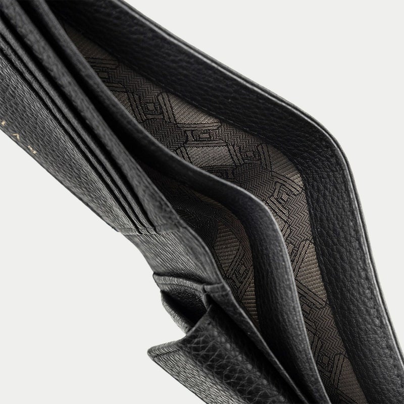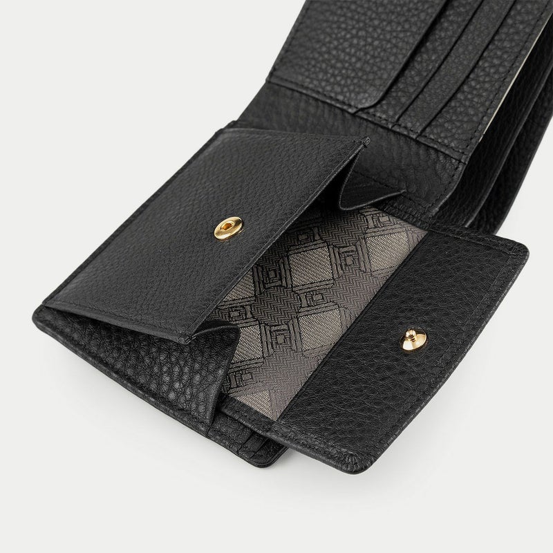 普段使いとしての扱いやすさとともに、収納物を出し入れしやすい快適な使い心地を追求し、あえて横幅に余裕を持たせる設計にした二つ折り財布。右サイドのスナップボタン式小銭入れも、広めの横幅を備えているので、コインだけでなく鍵などの収納も可能です。左サイドには、カードポケット3つを設けたカード段を装備し、美しいカーブを描いている流線形のカッティングラインが魅力。また、そのカード段の背面に1つ、小銭入れの背面に2つ、計3つのフリーポケットには、カードだけでなく名刺なども入れておけます。さらに、その両サイドの背面にある、2室に分かれた札入れも便利。横幅が十分に長いので、紙幣や領収書などを、ゆったりと収納しておけます。