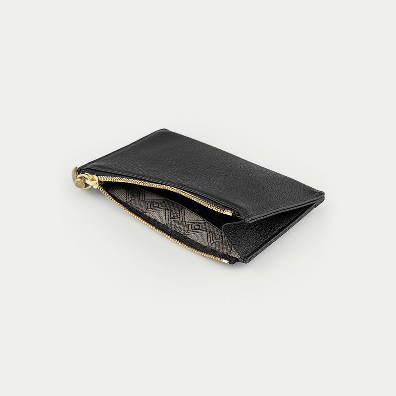 そのファスナーを開くと、マチが付いているので開口部が広く、内装の素材にはブランドオリジナルの「ジャガード生地」を採用するとともに、外装と同じ「シュリンクレザー」の華やかなカードポケット1つを装備。また、内装は、縦幅を確保しながら前面・背面を縫製せずに繋がっている底面により、二つ折りに畳んだ紙幣を横向きにして入れられるスペースも叶えています。