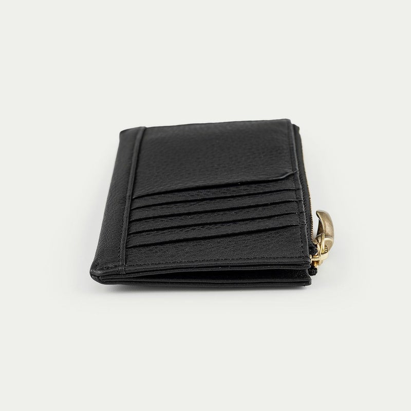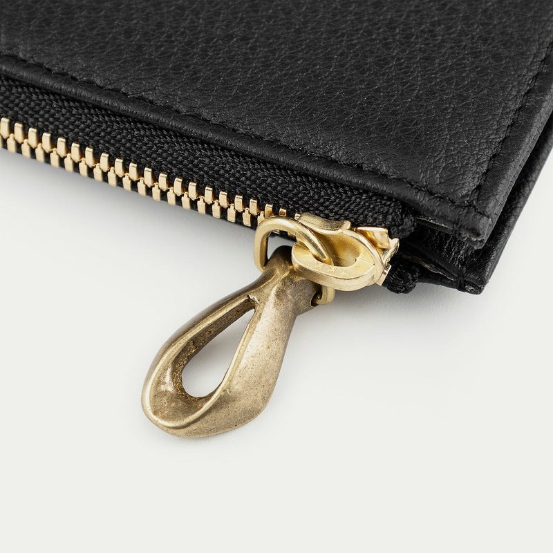 手のひらに収まるコンパクトなサイズ感でありながら、見た目以上の収納性を兼ね備えた、スタイリッシュなフラグメントケース。外装には、上品なシボ感が美しい「シュリンクレザー」を纏わせ、弾力のある柔らかな質感と優れた強度で、手に馴染みやすいのも特長です。背面に備えた5つのカードポケットは、それぞれのカットラインに緩やかな曲線を施し、個性的な佇まいへの美学を追求。また、高級感を醸すYKK最高峰のエクセラWファスナーに、メビウスの輪をモチーフにしたオリジナルの「真鍮金具」の引き手を組み合わせたデザイン性も魅力です。