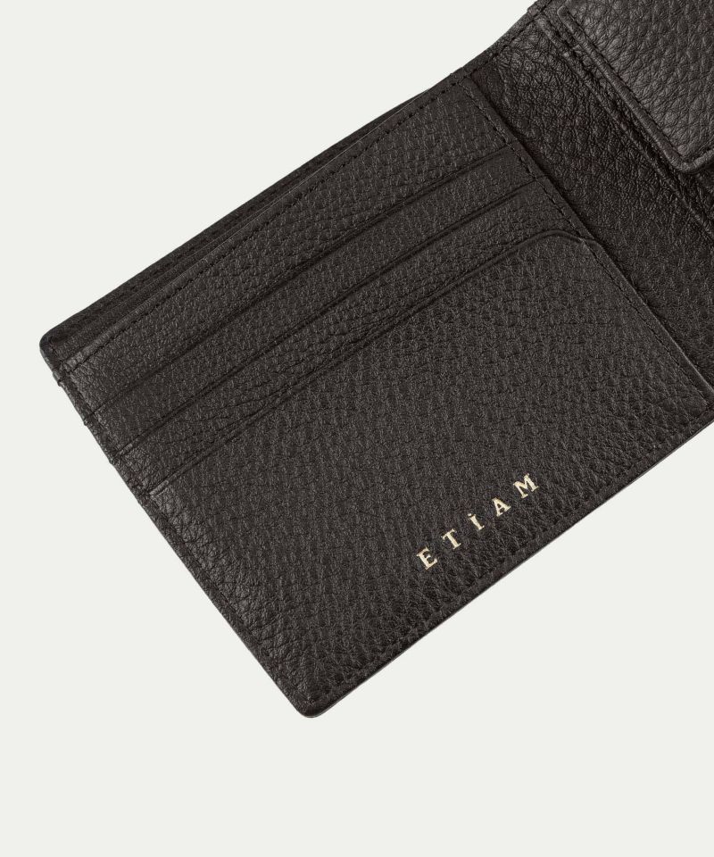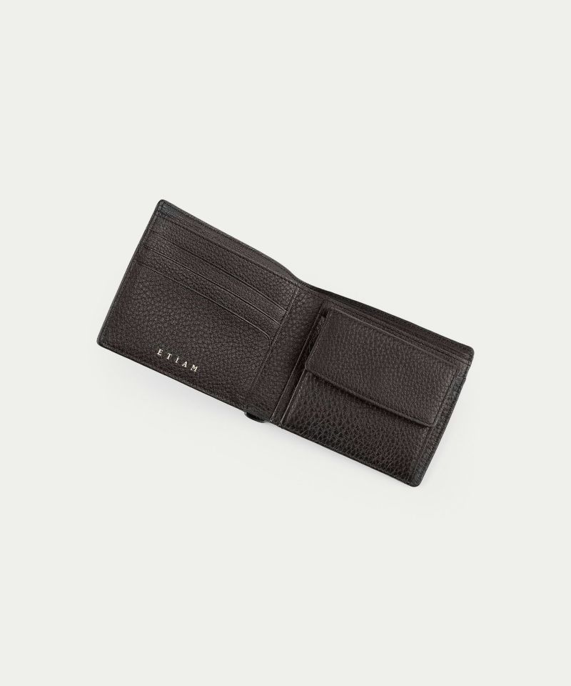 普段使いとしての扱いやすさとともに、収納物を出し入れしやすい快適な使い心地を追求し、あえて横幅に余裕を持たせる設計にした二つ折り財布。右サイドのスナップボタン式小銭入れも、広めの横幅を備えているので、コインだけでなく鍵などの収納も可能です。左サイドには、カードポケット3つを設けたカード段を装備し、美しいカーブを描いている流線形のカッティングラインが魅力。また、そのカード段の背面に1つ、小銭入れの背面に2つ、計3つのフリーポケットには、カードだけでなく名刺なども入れておけます。さらに、その両サイドの背面にある、2室に分かれた札入れも便利。横幅が十分に長いので、紙幣や領収書などを、ゆったりと収納しておけます。