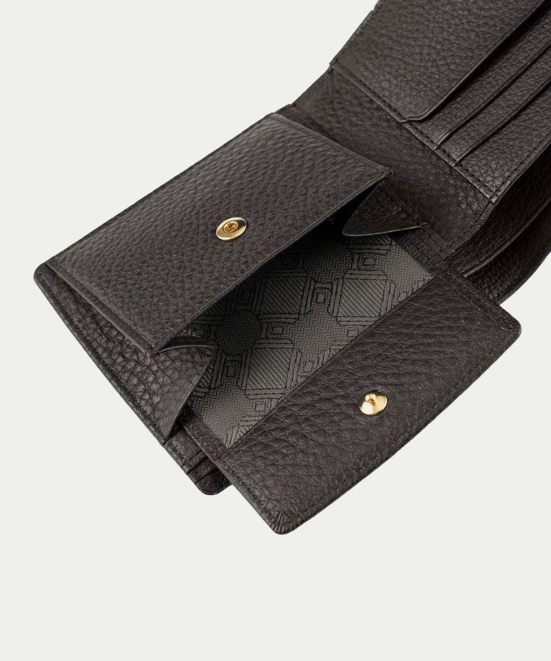 外装・内装に纏わせている、美しいシボ感が上品な「シュリンクレザー」は、弾力のある柔らかな質感と優れた強度を併せ持ち、手に馴染みやすいのが特長。そして、二つ折りの両端を直線にするのではなく、緩やかな曲線にすることで、優雅なシルエットへと導いています。