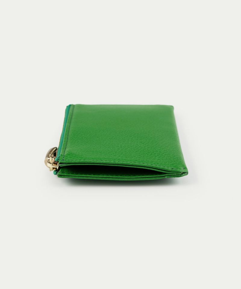 そのファスナーを開くと、マチが付いているので開口部が広く、内装の素材にはブランドオリジナルの「ジャガード生地」を採用するとともに、外装と同じ「シュリンクレザー」の華やかなカードポケット1つを装備。また、内装は、縦幅を確保しながら前面・背面を縫製せずに繋がっている底面により、二つ折りに畳んだ紙幣を横向きにして入れられるスペースも叶えています。