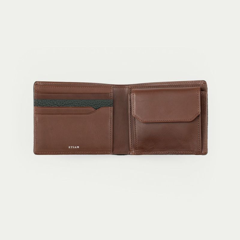 二つ折りタイプのオールインワン設計でありながら、スーツのポケットにもコンパクトなバックにもスマートに収まって持ち歩ける、薄さにこだわり抜いた二つ折り財布。外装には、しなやかな柔らかさとナチュラルなシボが魅力的なドイツ・ベリンガー社製「シュランケンカーフ」を採用し、キズが付きにくく色落ちもしにくいので、ラフな扱い方をしてもキレイな状態のまま使いこなせます。カードポケット1段の内装装飾として外装と同じ素材&カラーをあしらい、内装その他の見えるパーツすべてに牛革を使用して贅沢感を漂わせながら、内装装飾が差し色のアクセントになり洒落感を創出。その下2段のカードポケットのカッティングラインにはカーブが施され、エレガントさを醸し出しています。