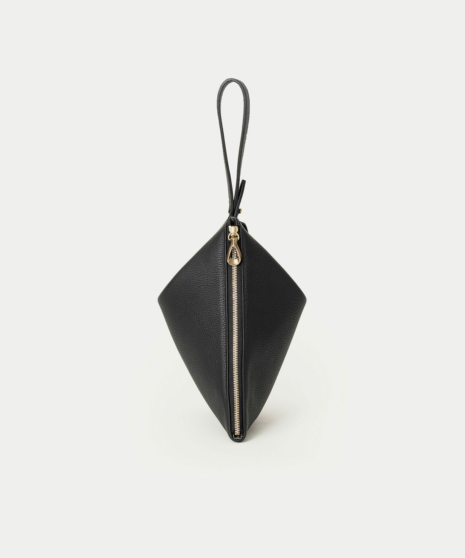 シボ感が美しい「シュリンクレザー」のボディに、柔らかくて程よいハリのある芯材を用いることで、型崩れしにくくキレイな形状のまま長く使いこなせるのも魅力。ハギ(繋ぎ目)は、前面センターに入れるのではなく、あえて両サイド斜めに設けることで、上部の三角形を生かした菱形のエレガントな印象へ。同じ素材のレザーストラップは、接続金具を軸にフレキシブルに回転し、軽やかに手首に通して持ち歩くことができます。