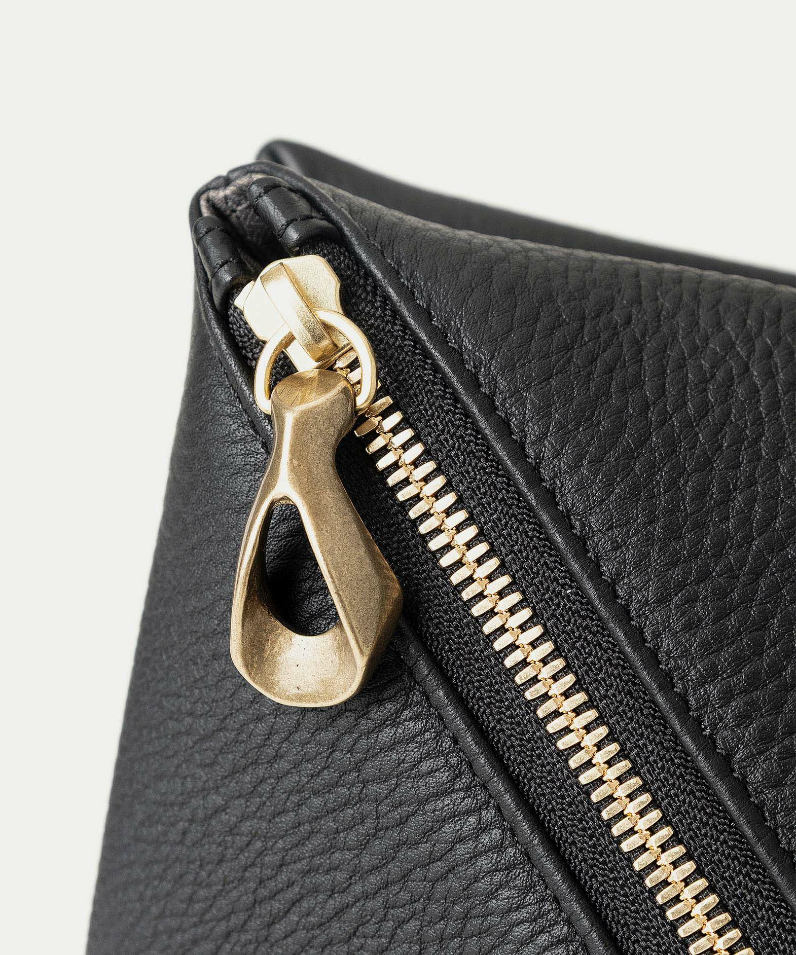 背面の開閉には、YKK最高峰のエクセラWファスナーを採用し、スマートフォンやミニ財布などをしっかり収納・携帯することが可能。内装にはファスナーポケットを備えているので、鍵・パスケース・小物などを整理して入れておけます。また、下部を内側に折り畳むことで平たくコンパクトにでき、かさばらずにバッグやスーツケースに収納することも。普段使いだけでなく、旅先や出張先などでもスマートに活躍してくれます。