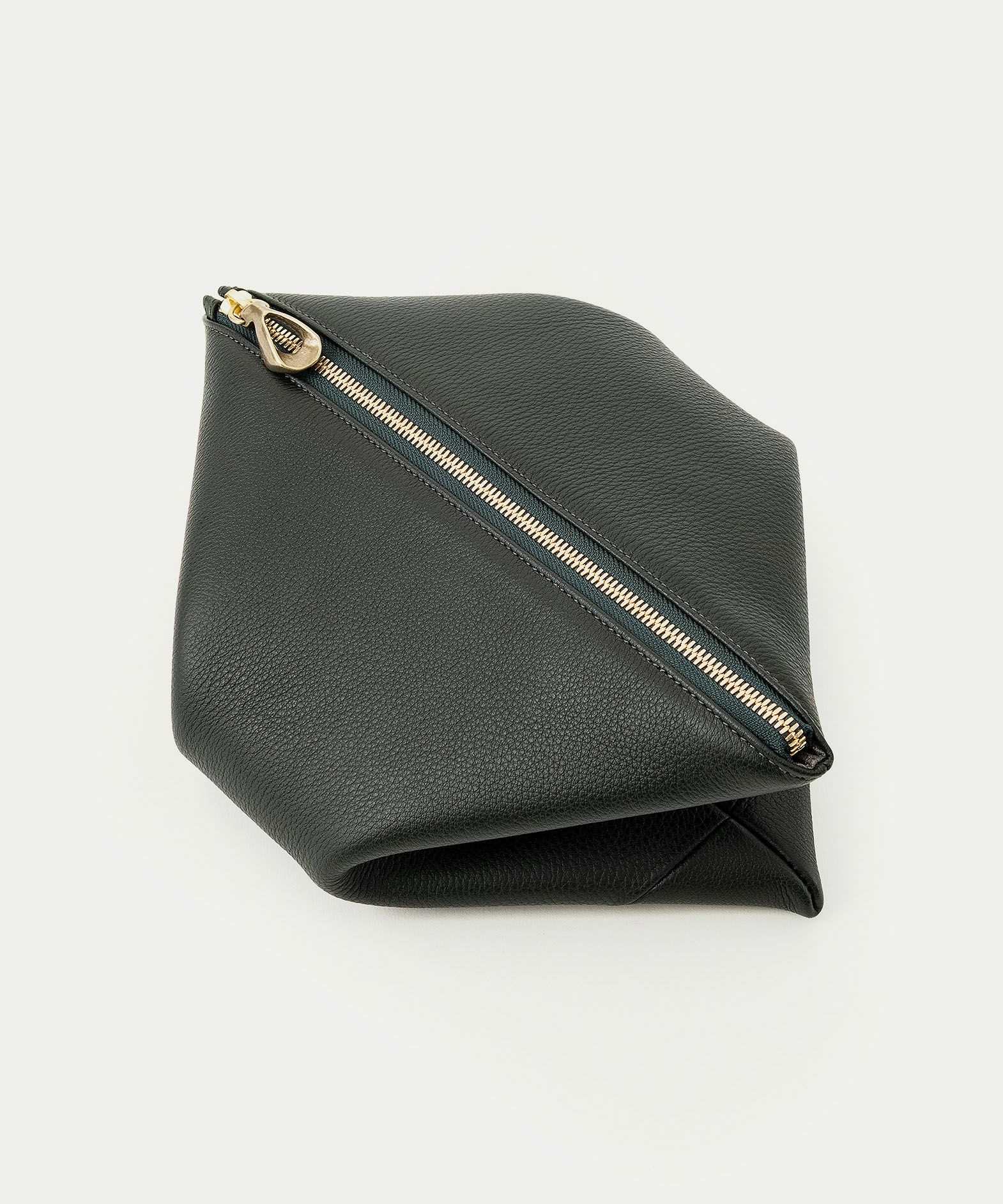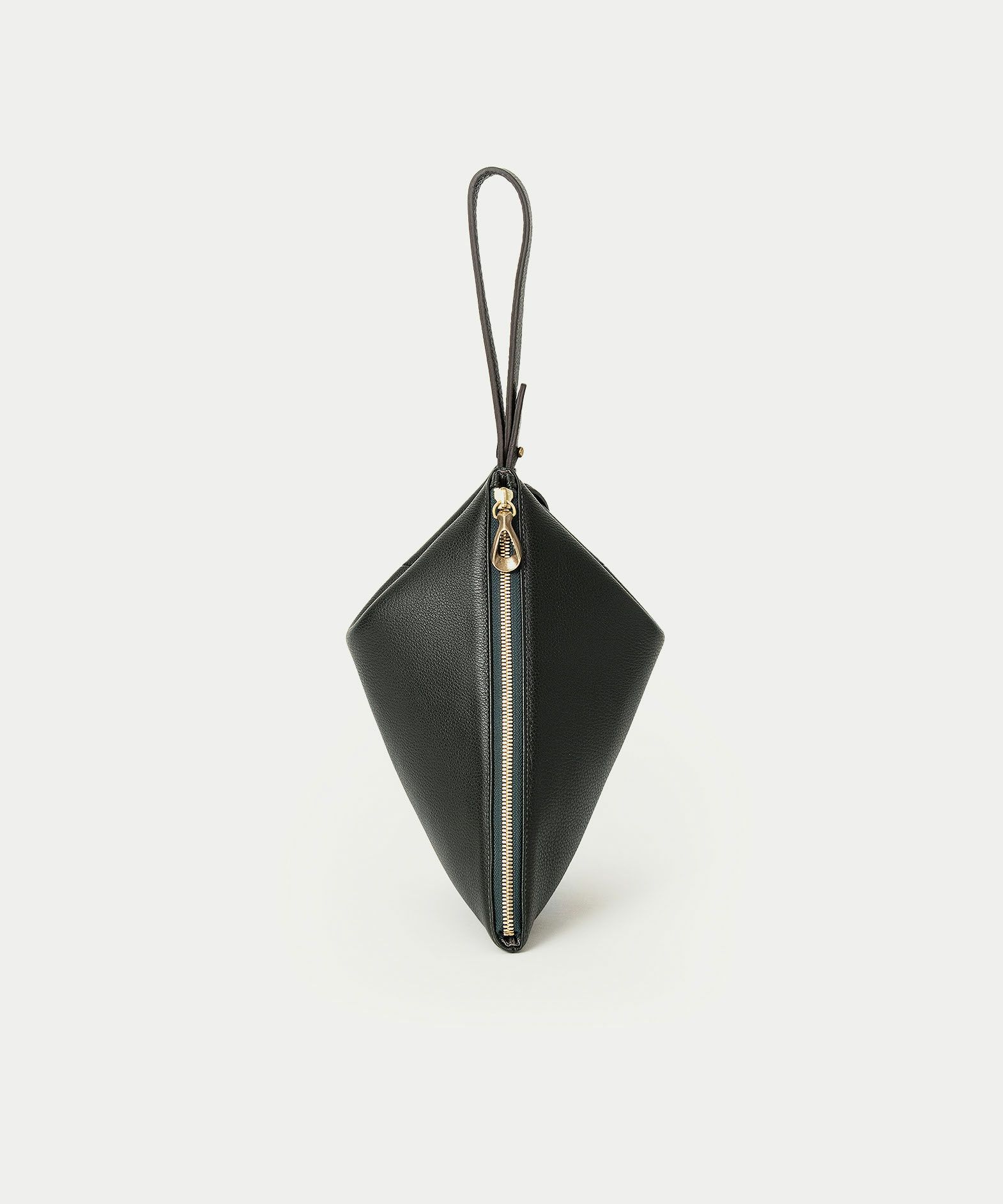 シボ感が美しい「シュリンクレザー」のボディに、柔らかくて程よいハリのある芯材を用いることで、型崩れしにくくキレイな形状のまま長く使いこなせるのも魅力。ハギ(繋ぎ目)は、前面センターに入れるのではなく、あえて両サイド斜めに設けることで、上部の三角形を生かした菱形のエレガントな印象へ。同じ素材のレザーストラップは、接続金具を軸にフレキシブルに回転し、軽やかに手首に通して持ち歩くことができます。