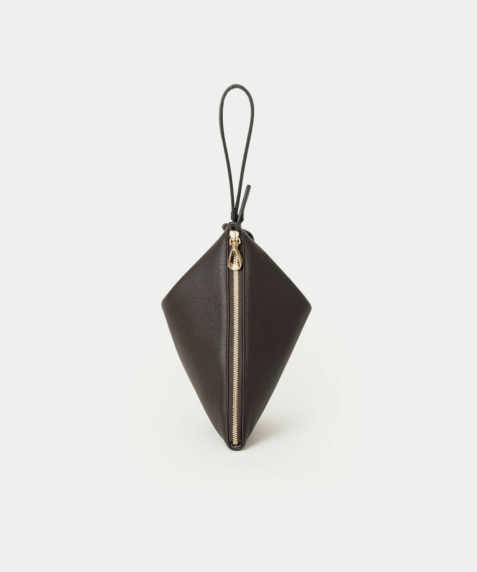 シボ感が美しい「シュリンクレザー」のボディに、柔らかくて程よいハリのある芯材を用いることで、型崩れしにくくキレイな形状のまま長く使いこなせるのも魅力。ハギ(繋ぎ目)は、前面センターに入れるのではなく、あえて両サイド斜めに設けることで、上部の三角形を生かした菱形のエレガントな印象へ。同じ素材のレザーストラップは、接続金具を軸にフレキシブルに回転し、軽やかに手首に通して持ち歩くことができます。