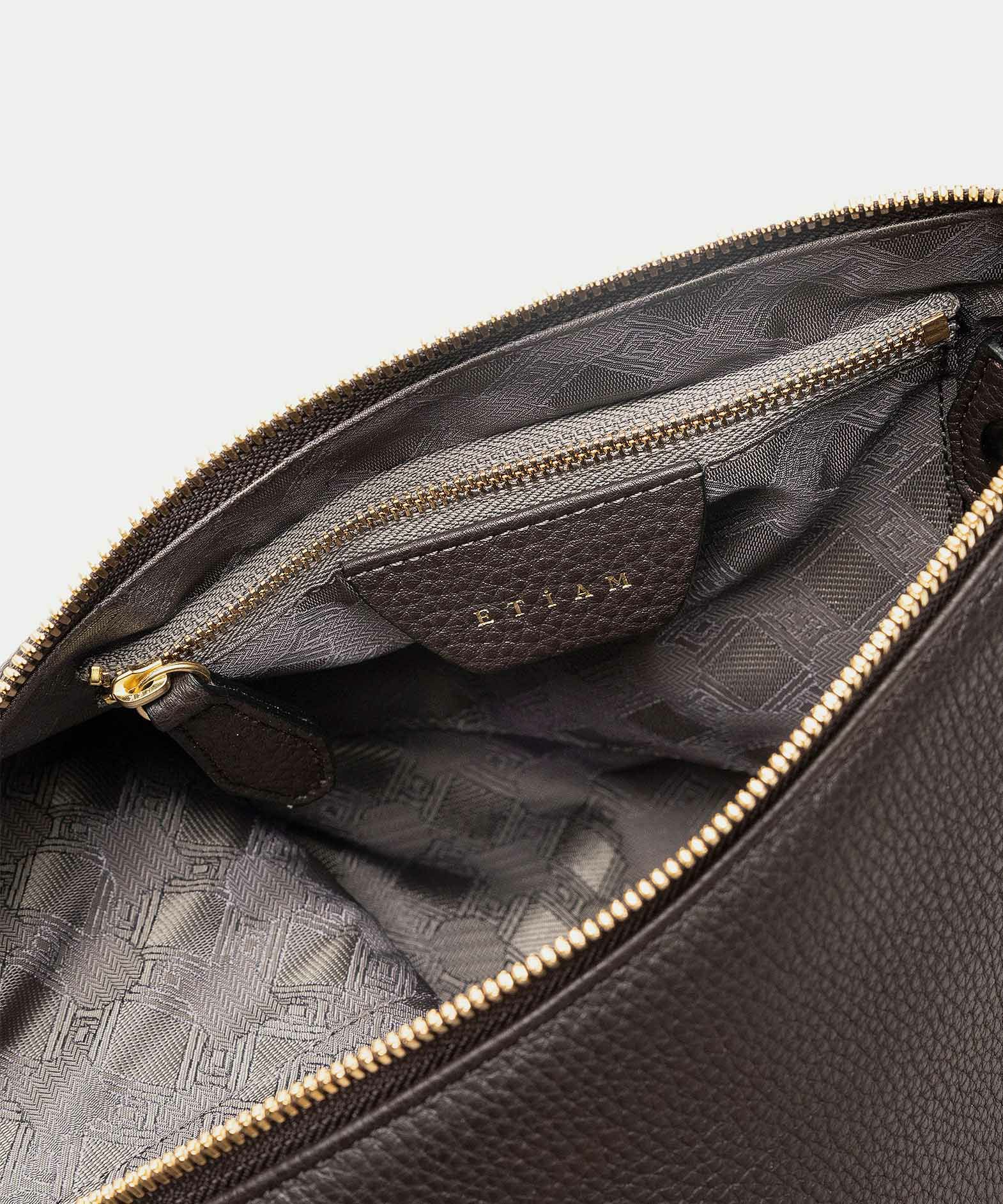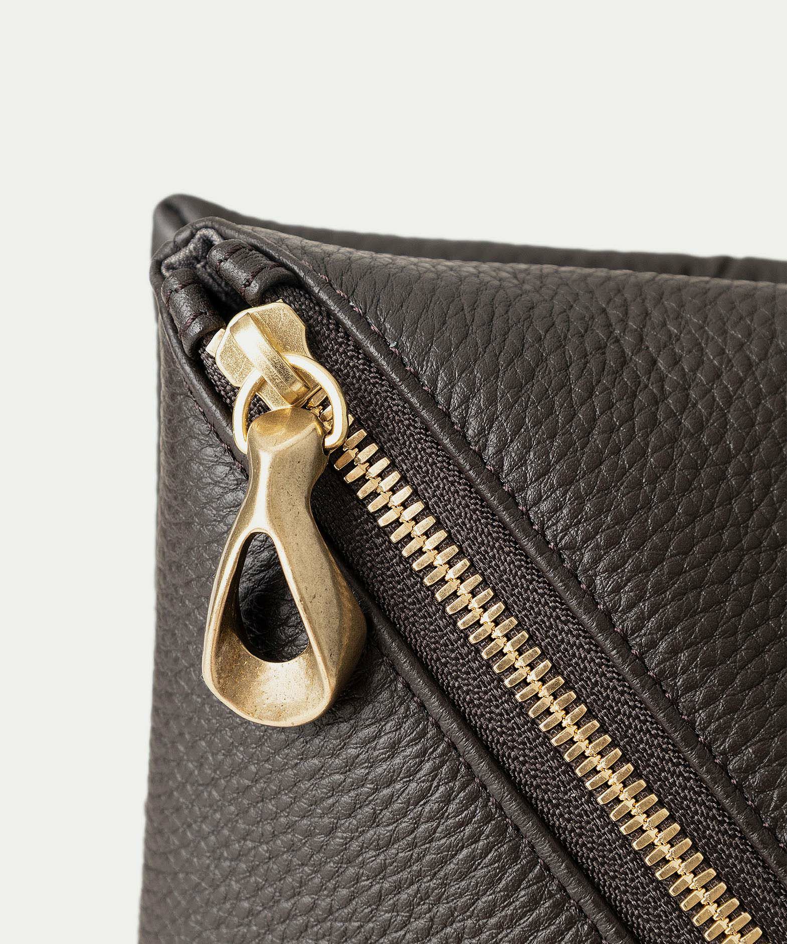 背面の開閉には、YKK最高峰のエクセラWファスナーを採用し、スマートフォンやミニ財布などをしっかり収納・携帯することが可能。内装にはファスナーポケットを備えているので、鍵・パスケース・小物などを整理して入れておけます。また、下部を内側に折り畳むことで平たくコンパクトにでき、かさばらずにバッグやスーツケースに収納することも。普段使いだけでなく、旅先や出張先などでもスマートに活躍してくれます。