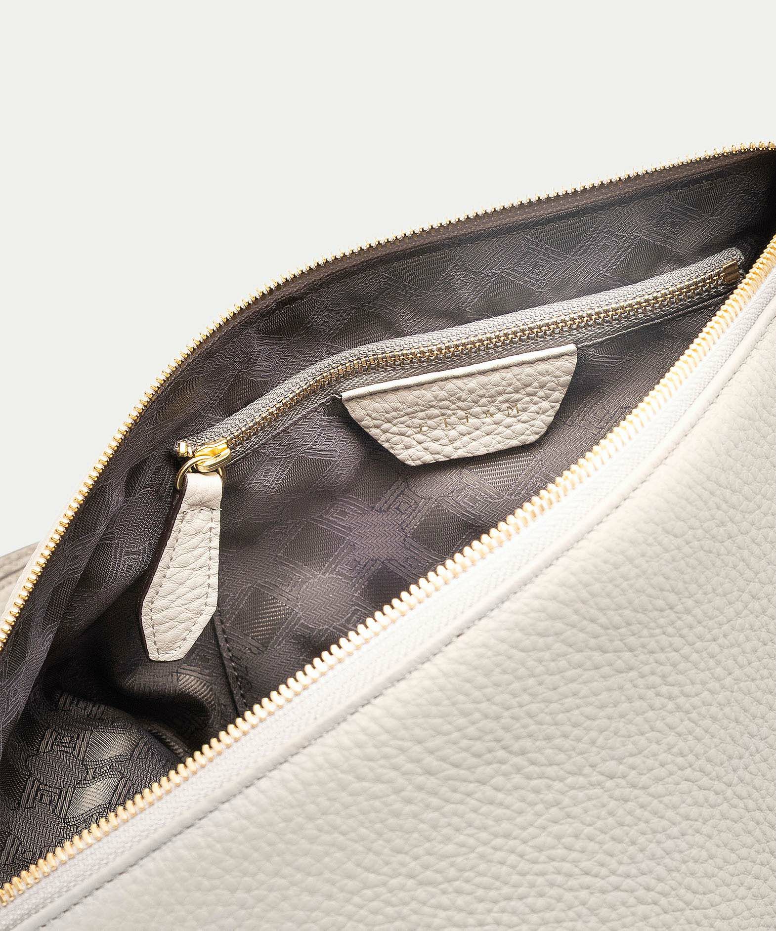 背面の開閉には、YKK最高峰のエクセラWファスナーを使用し、スマートフォン・ミニ財布・ペットボトルなどをしっかりと収納。また、内装にはファスナーポケットを装備し、鍵・パスケース・小物などを整理して持ち運べます。さらに、下部を内側に折り畳むことでコンパクトにでき、かさばらずにバッグやスーツケースへの収納も。普段使いはもちろん、旅先や出張先などでも性別を問わずスタイリッシュに使いこなせます。