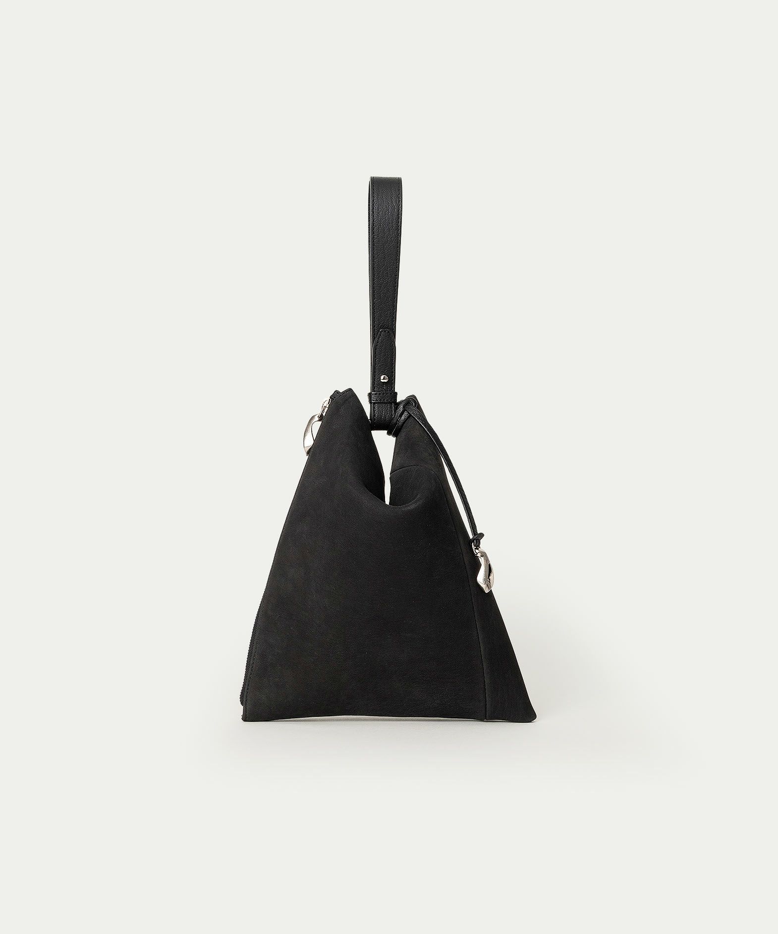 しっとりとした手触りと上品な起毛感が魅力で、牛革より軽く表面に撥水加工を施したゴートレザー「ヌバック」のボディに、柔らかくて程よいハリのある芯材を用いることで、型崩れしにくくキレイな形状のまま長く使いこなせるのも魅力。ハギ(繋ぎ目)は、前面センターに入れるのではなく、あえて両サイド斜めに設けることで、上部の三角形を生かした菱形のエレガントな印象へ。ゴートレザーのストラップは、接続金具を軸にフレキシブルに回転し、軽やかに手首に通して持ち歩くことができます。