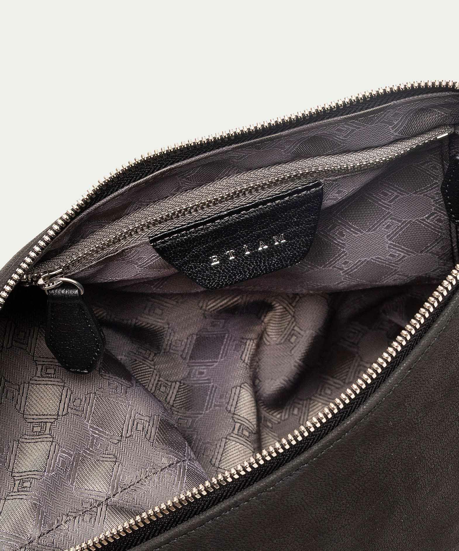 背面の開閉には、YKK最高峰のエクセラWファスナーを採用し、スマートフォンやミニ財布などをしっかり収納・携帯することが可能。内装にはファスナーポケットを備えているので、鍵・パスケース・小物などを整理して入れておけます。また、下部を内側に折り畳むことで平たくコンパクトにでき、かさばらずにバッグやスーツケースに収納することも。普段使いだけでなく、旅先や出張先などでもスマートに活躍してくれます。