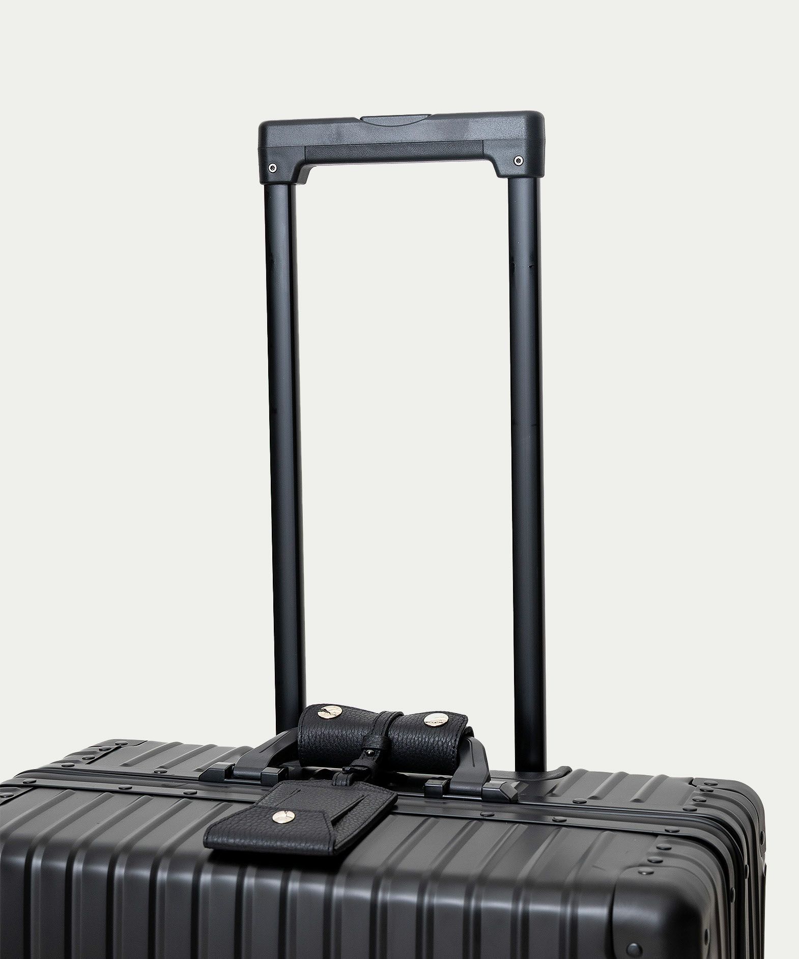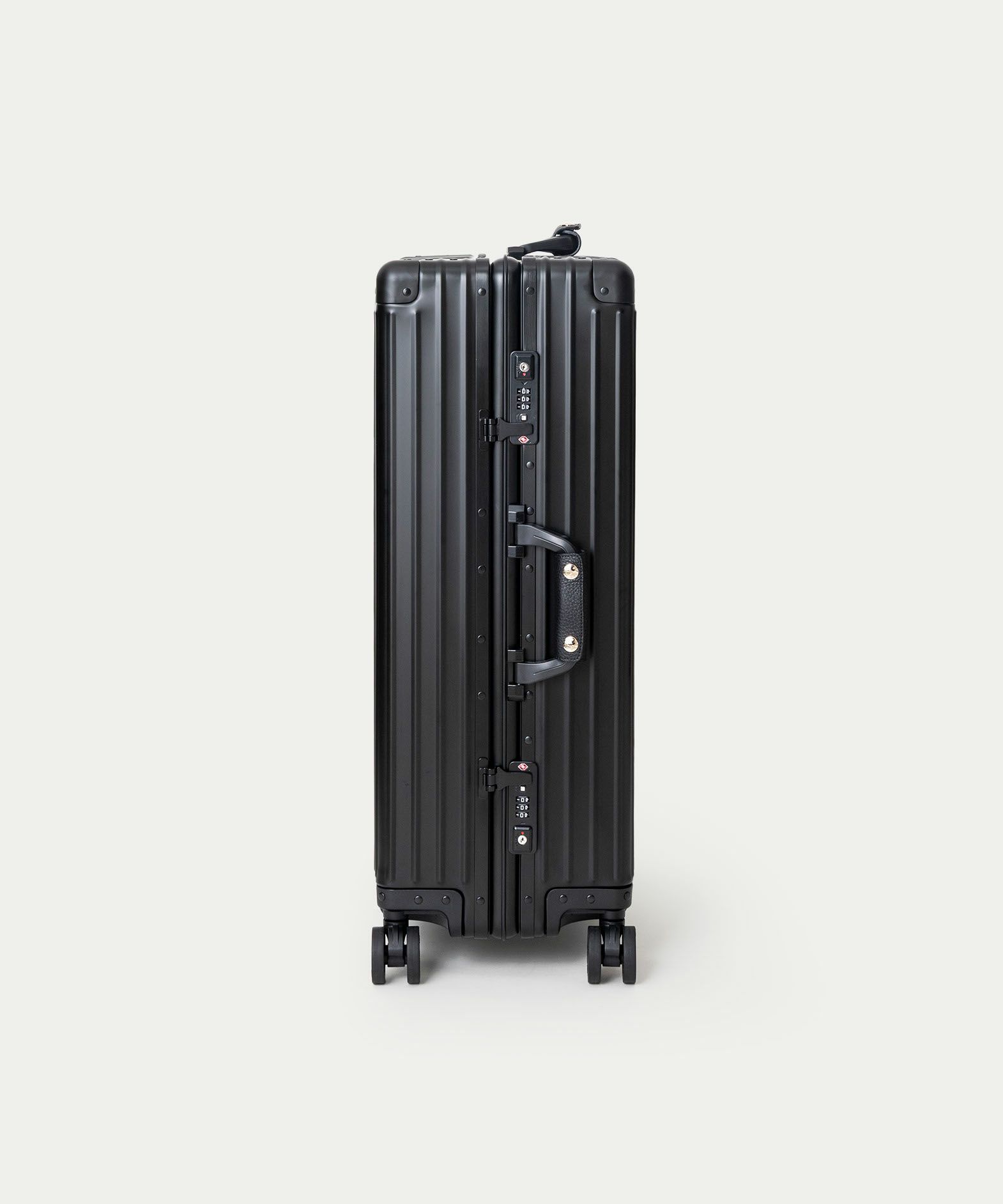 本体の素材には、高品質なアルミニウム合金〈5052-H32〉を採用。建築外装材・ノートPCなどにも使用される信頼性の高さと、耐食性・成形性・軽量性に優れているのが特長です。アルミニウム加工に特化した工場で、フレーム・ボディそれぞれを専用機械で精密に成形。平面1枚のアルミ板から、プレス・切り出し・成形する工程を経て、一体感のある美しいフォルムへと仕上げています。そして、洗練された輝きを放つ柔らかな曲線と上品な光沢による、クラシックな佇まいと存在感が、旅のスタイルを格上げするように演出。使い込むほどに刻まれる小さな凹みやキズは、ETiAMのバッグにも使われている「シュリンクレザー」のハンドルカバーやネームタグとともにに、味わいを増しながら思い出深く育っていくのも魅力です。